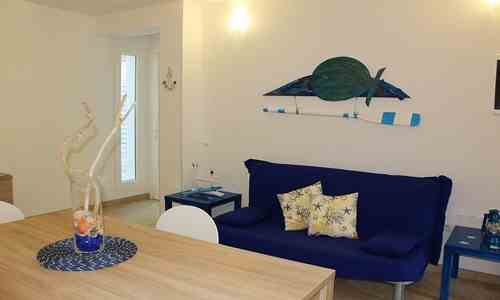 La villetta è strutturata su tre livelli: piano ribassato con camera da letto matrimoniale e bagno con box doccia; piano terra con ampio soggiorno - angolo cottura, cortile antistante e spazioso terrazzo retrostante ombreggiato ed arredato per soggiornare e/o mangiare all'aperto; piano primo con camera da letto matrimoniale da cui si accede su una veranda con spettacolare vista mare, cameretta con letto a ponte (che all'occorrenza diventa matrimoniale) da cui si accede su una seconda veranda e bagno con box doccia. Posti letto 5+1 su richiesta (con supplemento di € 150,00 a settimana).