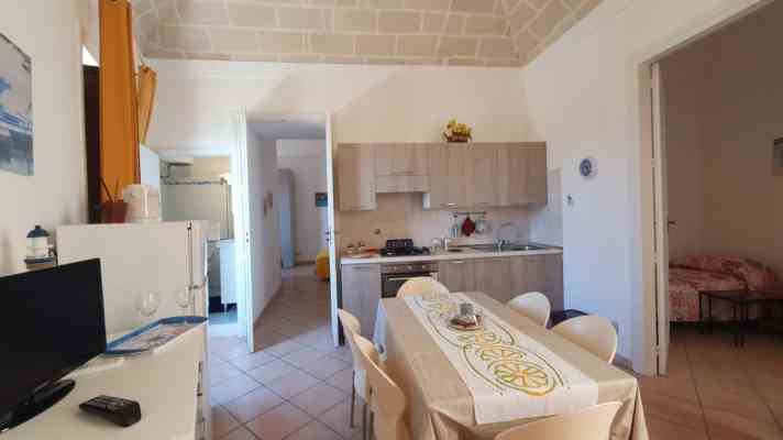 -cucina-pranzo abitabile, dotato di climatizzatore e ventilatore a tetto, tavolo da pranzo a 6 posti, divano, TV, frigo-congelatore, cucina a quattro fuochi a gas, completa di forno, lavatrice, piccolo balcone con vista su strada principale di ingresso e giardino ipogeo.